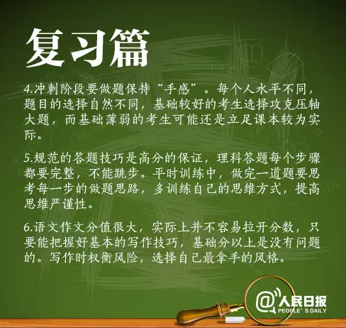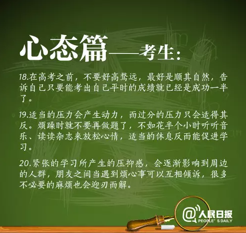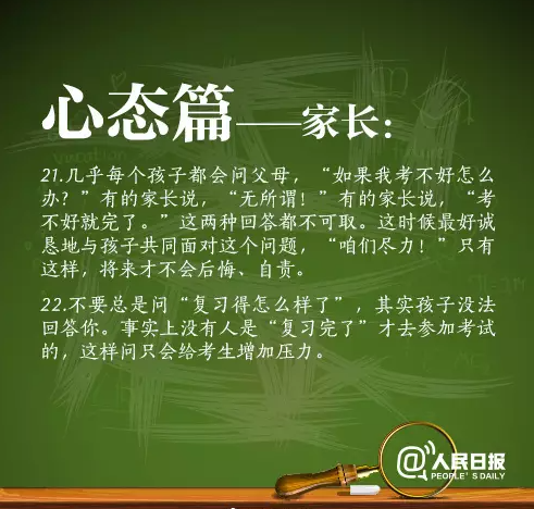 父母说了这句话自己感觉有定心丸,自己肯定会尽力的,这样减少了不少心理压力,就会从容地应对高考。但也有些家长高考前唠唠叨叨,反复嘱咐孩子,考试要认真,不要马虎,一分之差,千人之后,你一定要改变马虎的习惯,现在可不能丢分了,你可要注意呀。其实,这样的话家长已经讲了多少遍,在高考前再讲、反复地讲会增加孩子的心理压力。高考前,孩子和父母发生口角对情绪的稳定会起很大的破坏作用,这对考试的影响是不能低估的。