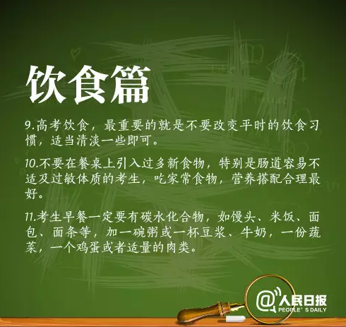 有些家长误认为高考前应该给孩子加强营养,给孩子吃大鱼大肉。小编觉得,其实那没有必要,孩子平时吃什么就吃什么,孩子爱吃什么就吃什么,只要孩子食欲好,在一般情况下孩子的营养都会得到满足,关键是要做到营养平衡,合理。不在于说给孩子增加什么蛋白质就能提高什么记忆能力,这种增加蛋白质和提高记忆力的关系暂且不说,就算真的吃了富含蛋白质的东西短期内也不可能提高记忆力。高考学生篇