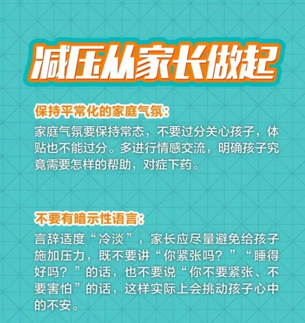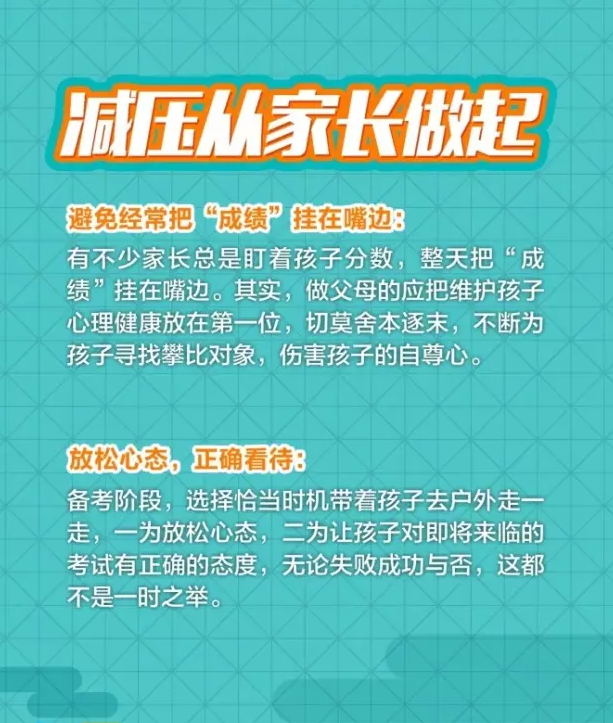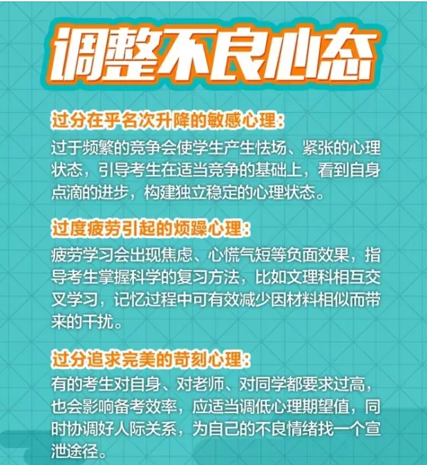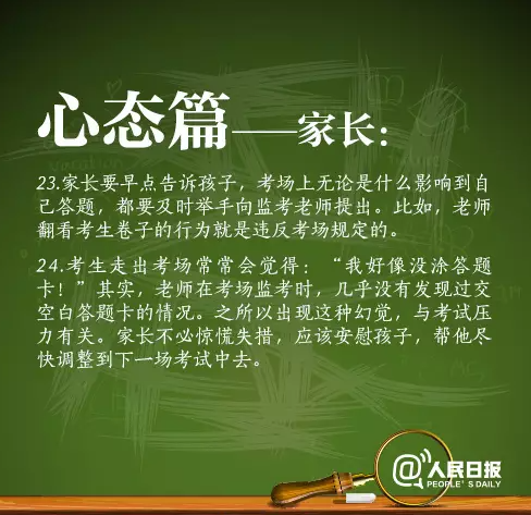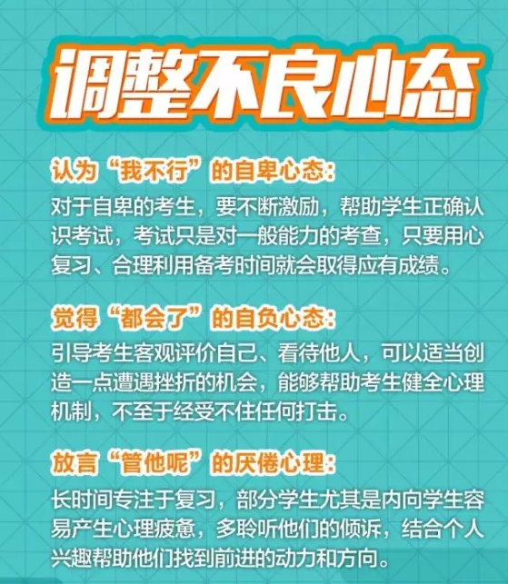 在高考前,特别是孩子在家备考期间,家长要摆脱各种外界的干扰,经常保持比较平和的心态,这对孩子能以稳定的情绪、平和的心态去对待考试是很有意义的。高考前,家长也会对高考的各种动态有所反应,但是,要冷静对待,要有分析地对待,更不能把一些小道消息随便传给孩子。