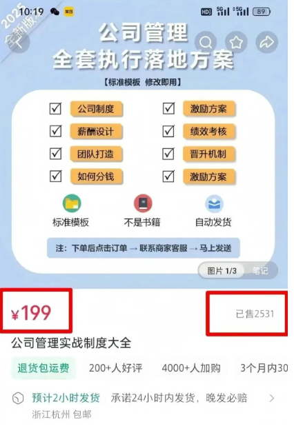 我们先来看一个实际案例:小红书上有个博主专门卖企业管理资料包,客单价199元,一共卖出了2500多单,简单算一下,收入超过了50万元
