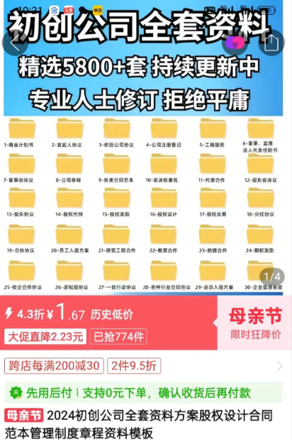 那么他的成本是多少呢?我在拼夕夕搜了下,同样的资料只要1块6毛7,大家可以自己算算这个利润率,这也正是我一直推荐大家关注虚拟资料生意的原因