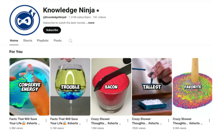 比如频道@KnowledgeNinjaX,仅发布了101个短片,却已经收获了130万订阅者,总播放量高达2.82亿