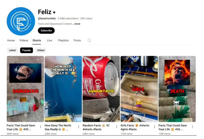 还有类似的频道@factsfromfeliz,用同样的方法拿下了330万订阅,播放量超过4.29亿
