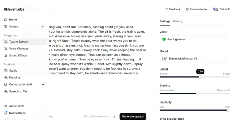 选择一个适合视频情感氛围的声音(如美国男声,电影感强),粘贴你的脚本,调整一下清晰度和节奏,点击生成
