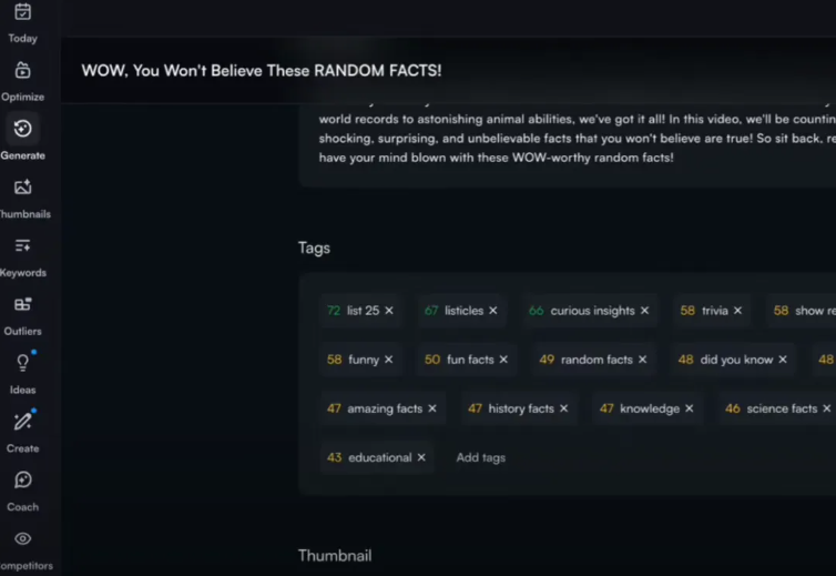只需输入频道主题相关关键词(比如“random facts”),就能获得一堆搜索量高的关键词建议