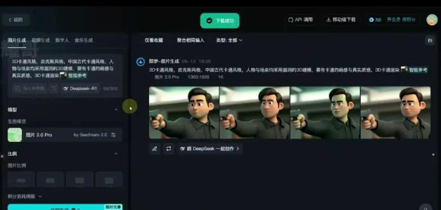 接下来,打开AI工具,点击图片生成,提示词可以这样写,然后上传参考图片,选择智能参考,点保存,再点立即生成,等一会儿图片就做好了