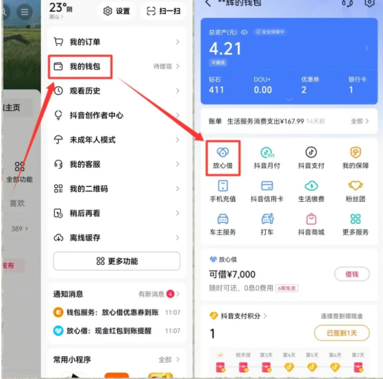 打开抖音,依次点击右下角【我】,右上角【三条杠】,选择【我的钱包】,再点进【放心借】